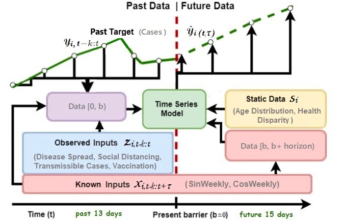 Observed or Past Inputs : Observed inputs are time-varying features known at each timestamp \(t \in [0, T_i]\) (e.g., Vacciation, Disease Spread, Social Distancing, Transmissible Cases), but their future values are unknown. We incorporate all past information within a lookback window of k (the past 13 days), using target (cases) and observed inputs upto the forecast start time t: \(\space y_{i,t-k:t} = {y_{i,t-k}, ..., y_{i, t} }\) and \(z_{i, t-k:t} = {z_{i,t-k}, ..., z_{i, t}}\).